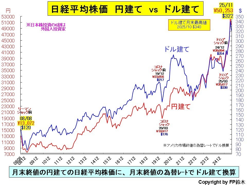 円建てでは2024年2月末に1989年12月末の最高値を更新していましたが、ドル建て日経平均株価は2025年6月に1989年12月末の最高値273$を更新し、更に10月には340$となり最高値を更新しました。