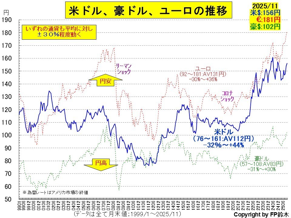 1999年から2025年10月迄の約27年間の米ドルの平均は112円。