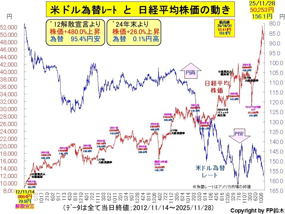 2012年12月に第2次安倍政権が誕生し、「3本の矢:アベノミクス」への期待から、株価は上昇、円安に。菅政権、岸田政権、石破政権、高市政権へと移行し、12年11か月経ちました。