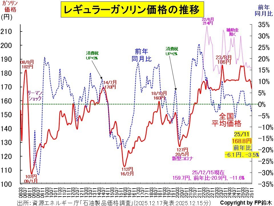 ◆資源エネルギー庁によると、レギュラーガソリンの全国平均価格は、2025年11月末は、前年同月よりも-6.1円低い168.8円。(補助金15.0円:補助金無し183.8円:グラフのピンク破線)