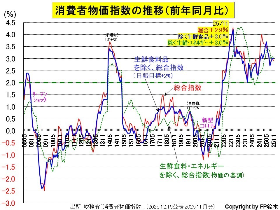総務省が2025年12月19日に発表した、2025年11月の消費者物価指数(生鮮食料品を除く)は、前月と変わらず前年同月比+3.0%となりました。