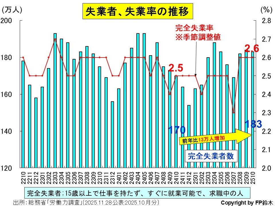 総務省が2025年11月28日に発表した「労働力調査」によると、2025年10月の失業率は2.6%で、前月と変わらず、前年同月比0.1ポイント悪化しました。