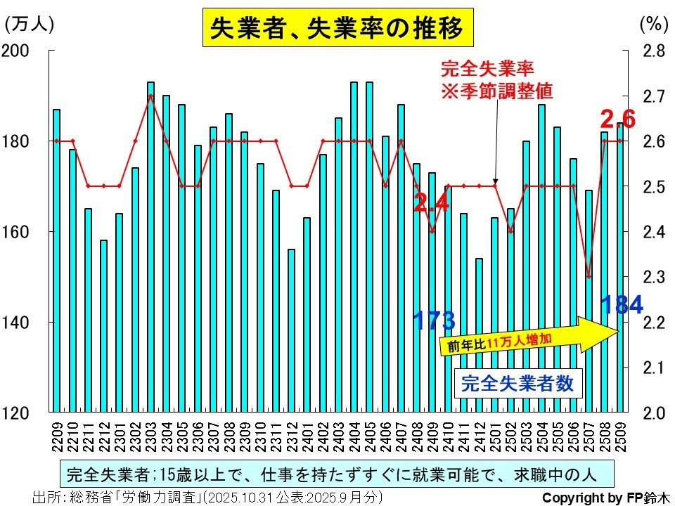 総務省が2025年10月31日に発表した「労働力調査」によると、2025年9月の失業率は2.6%で、前月と変わらず、前年同月比0.2ポイント悪化しました。