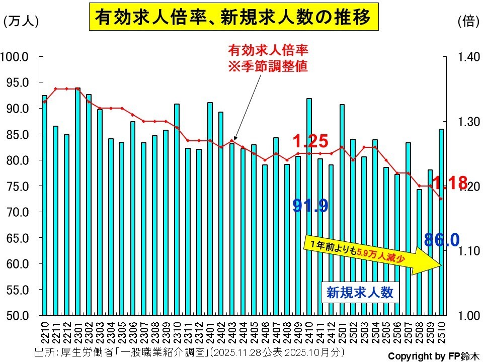 一方、厚生労働省が同日に発表した10月の有効求人倍率(季節調整値)は1.18倍。前月より-0.02ポイント悪化、前年同月比-0.07ポイント悪化となりました。
