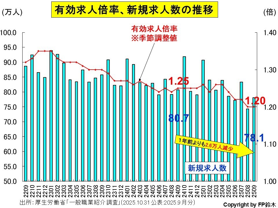 一方、厚生労働省が同日に発表した9月の有効求人倍率(季節調整値)は1.20倍。前月と変わらず、前年同月比0.05ポイント悪化となりました。
