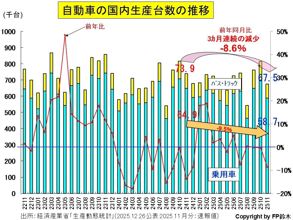 経済産業省が2025年12月26日に発表した、2025年11月の生産動態統計の自動車の国内生産台数(速報値)は、前年同月比-8.6%、前月比-17.0%の67.5万台となり、3か月連続の前年比減少となりました。