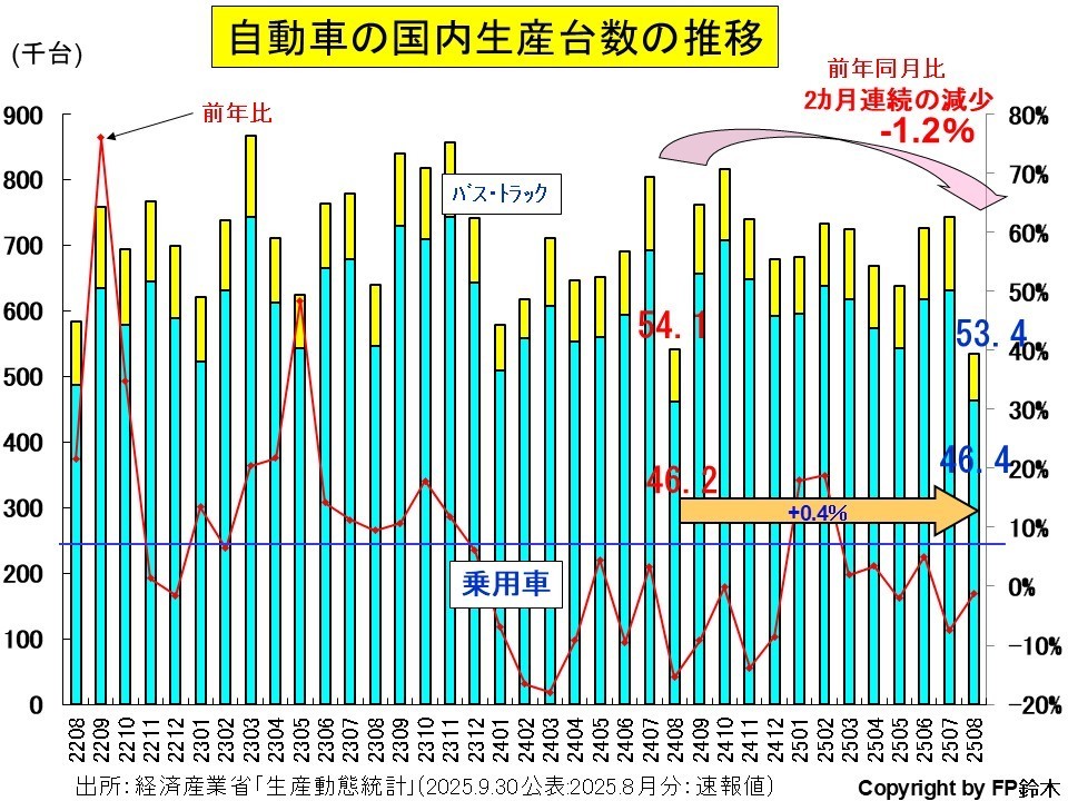 経済産業省が2025年9月30日に発表した、2025年8月の生産動態統計の自動車の国内生産台数(速報値)は、前年同月比-1.2%、前月比-28.1%の53.4万台となり、2か月連続の前年比減少となりました。