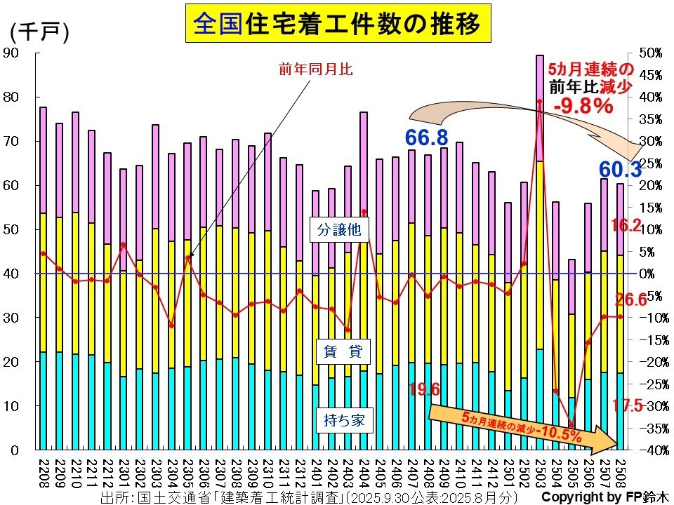 国土交通省が2025年9月30日に発表した、2025年8月の全国新設住宅の着工数は60.3千戸となり、前年同月比では-9.8%、前月比では-1.8%と、前年同月比では5か月連続で減少となりました。