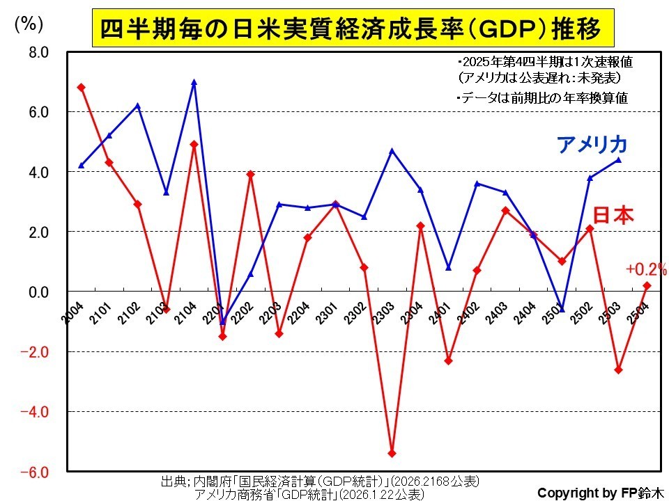 内閣府が2026年2月16日に発表した2025年第4四半期(10月~12月)の実質国内総生産(GDP)は、年率換算で前期比+0.2%の増加となり、2四半期ぶりにプラス成長となりました。