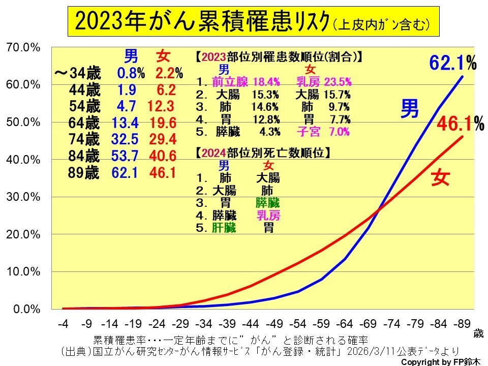 89歳までにガンと診断される確率は、男性62.1%(2021年比-0.4ポイント)、女性46.1%(+0.1ポイント)。