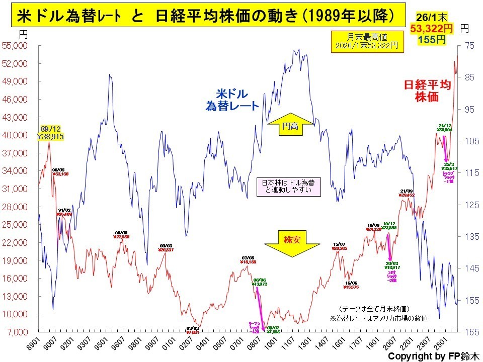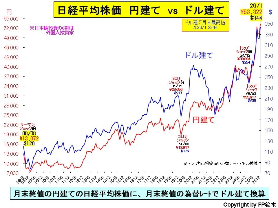 ドル建て日経平均株価は2025年6月に1989年12月末の最高値273$を更新し、更に2026年1月には344$となり最高値を更新しました。