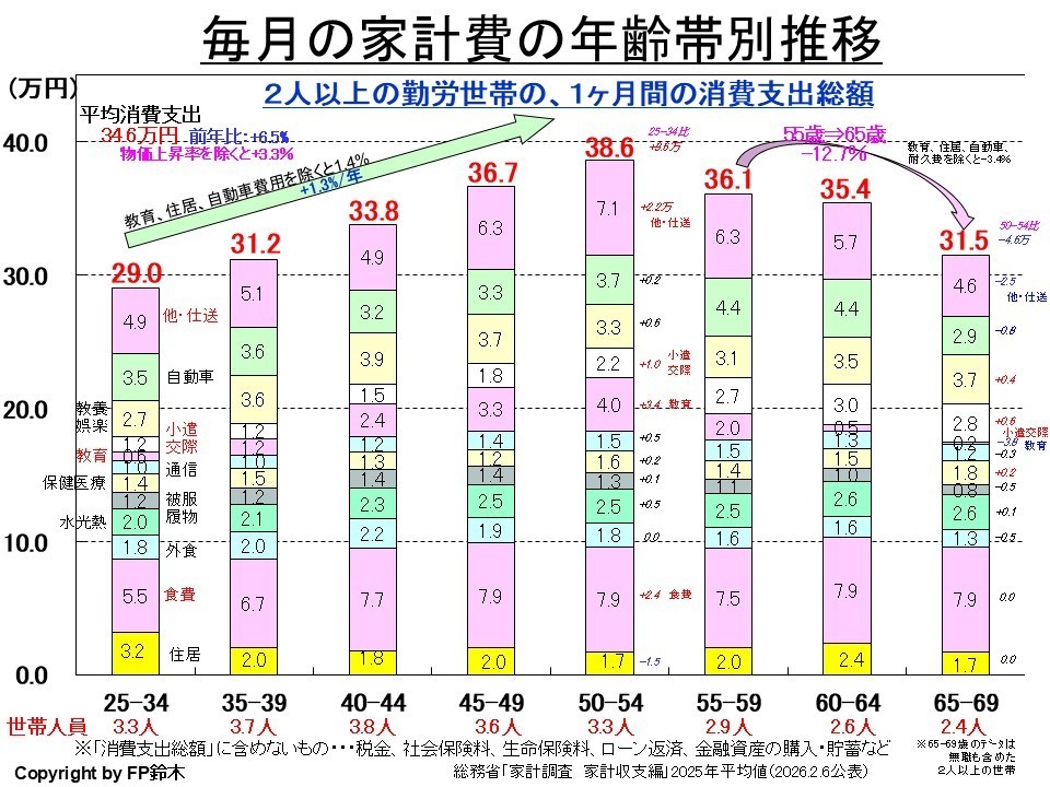 もう一つは、子供が生まれて世帯人員が増え、それとともに食費や教育費、仕送りが増えていくため。