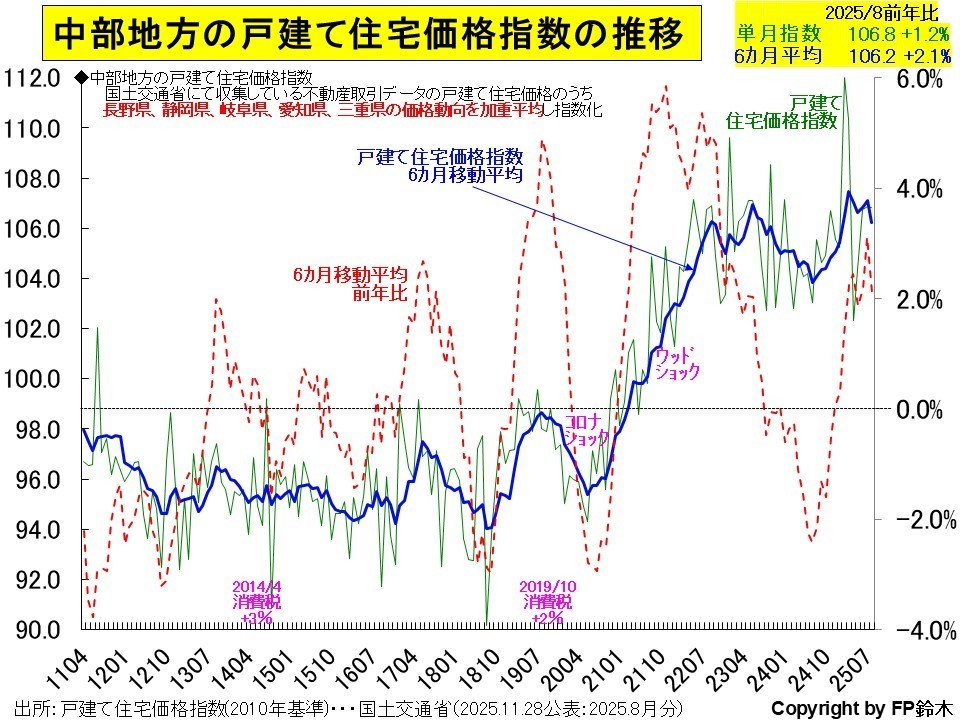 ★2025年11月28日に国土交通省が発表した2025年8月の中部地方の戸建て「住宅価格指数」(6か月移動平均)は9カ月連続で前年比上昇。
