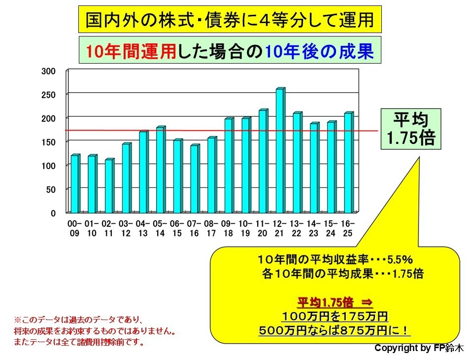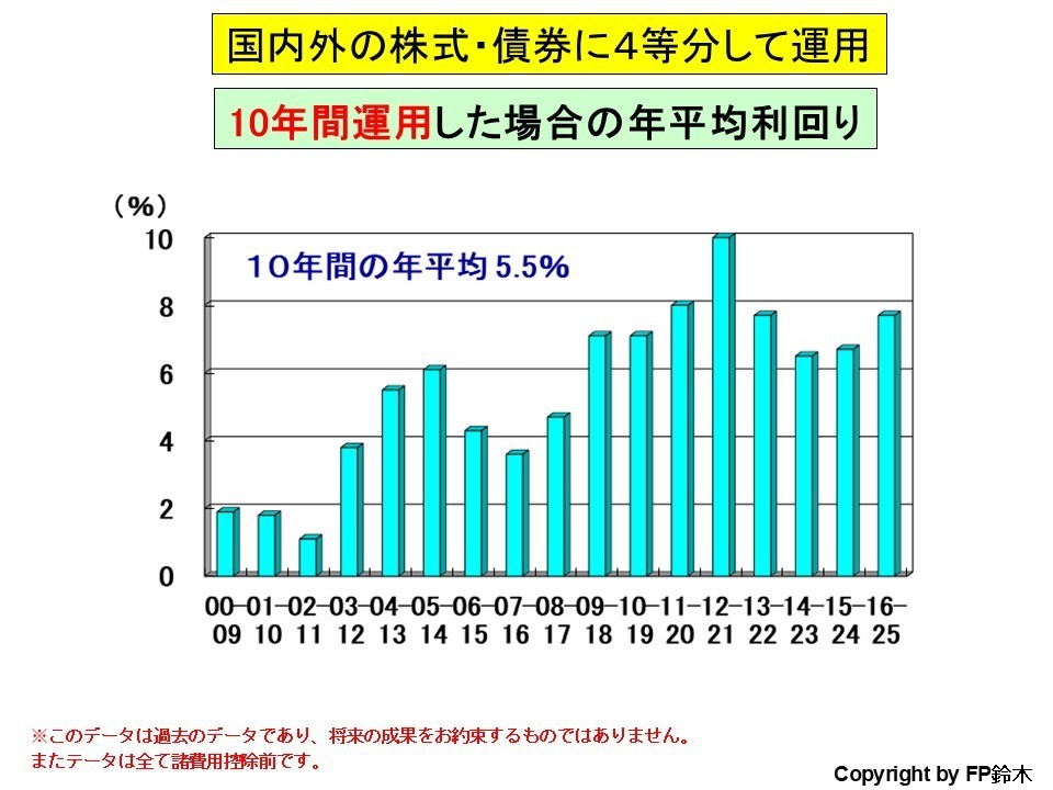 ※4等分で10年程度の運用をすれば、いつ投資を初めても、10年後にはプラスで終わっている、という意味です。