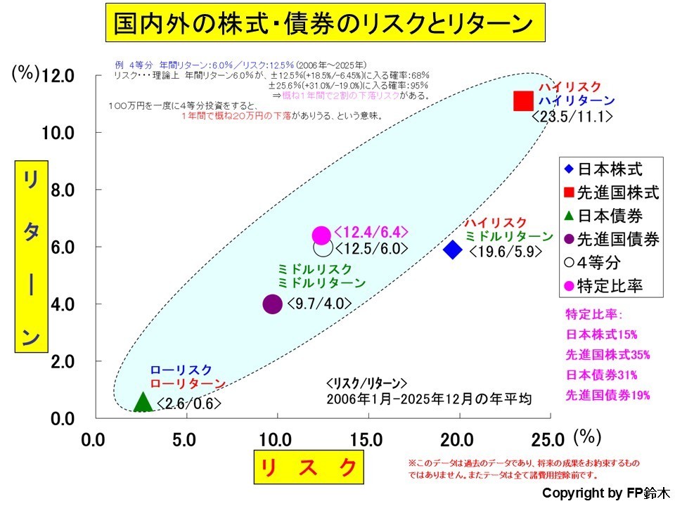◆2006年~2025年までの20年間で、各運用資産を4等分した場合の、単年度の運用では、収益率がマイナスになったのは5回あります。