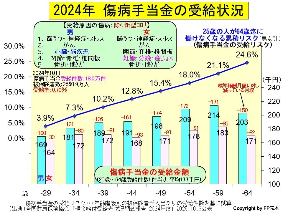 国健康保険協会(協会けんぽ)が2025年10月3日に公表した「現金給付受給者状況調査報告(令和6年度):傷病手当金」をもとに、働けないリスク(就労不能リスク)を作成しました。