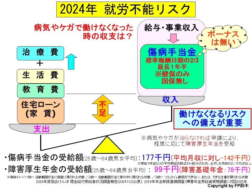 一方、25歳~64歳の傷病手当金の男女平均受給額は177千円。同年齢帯の平均標準報酬月額は319千円ですので、働けないことにより、月収が147千円減少しています。