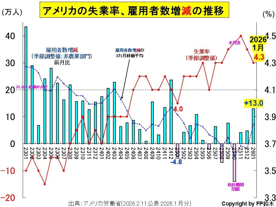 米国労働省が2026年2月11日に発表した2026年1月のアメリカの失業率は2025年12月より0.1ポイント改善の4.3%。前年同月比0.3ポイント悪化。