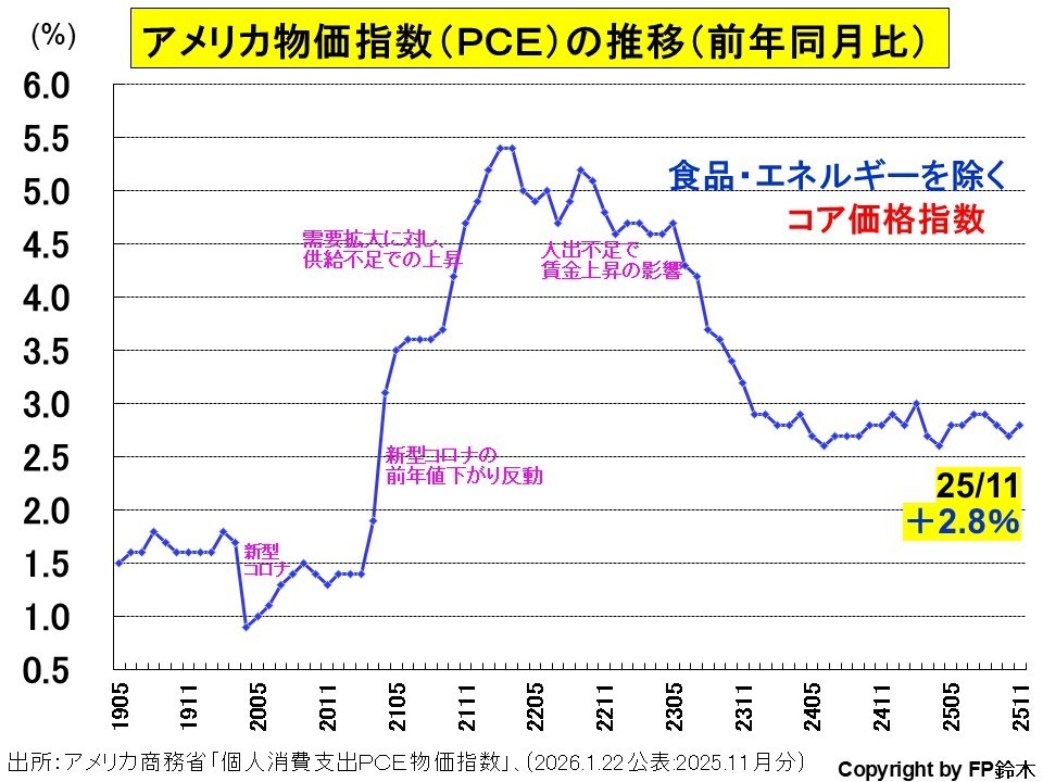 一方でFRBが物価の目安として注目する11月の個人消費支出(PCE)価格指数の総合:前年比物価上昇率は+2.8%(前月比+0.1ポイント)、そして特に重視されるコア(食品、エネルギーを除く)はグラフのとおり+2.8%(前月比+0.1ポイント)。