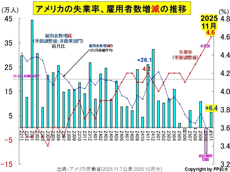 ※10月は-10.5万人と減少となりましたが、これは10月に政府機関が閉鎖され、公務員が失業(-16.2万人)とカウントされたためです。