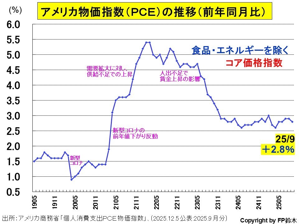 一方でFRBが物価の目安として注目する9月の個人消費支出(PCE)価格指数の総合:前年比物価上昇率は+2.8%(前月比+0.1ポイント)、そして特に重視されるコア(食品、エネルギーを除く)はグラフのとおり+2.8%(前月比-0.1ポイント)。