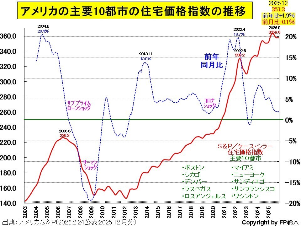◆2026年2月24日にアメリカS&Pが発表した、アメリカの主要な住宅価格指数「S&P コタリティ・ケース・シラー住宅価格指数」によると、2025年12月の主要10都市平均の指数は、前年同月比+1.9%の上昇となりました。