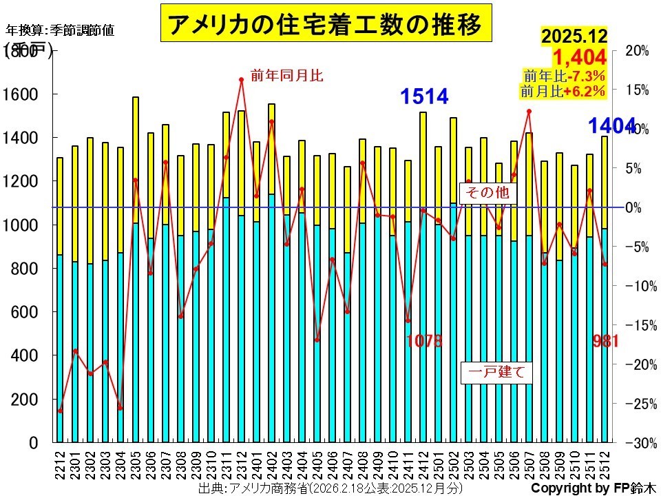 2026年2月18日にアメリカ商務省が発表した、2025年12月の「住宅着工数」は前年同月比で-7.3%、前月比では+6.2%。戸数は、年率換算で140.4万戸。