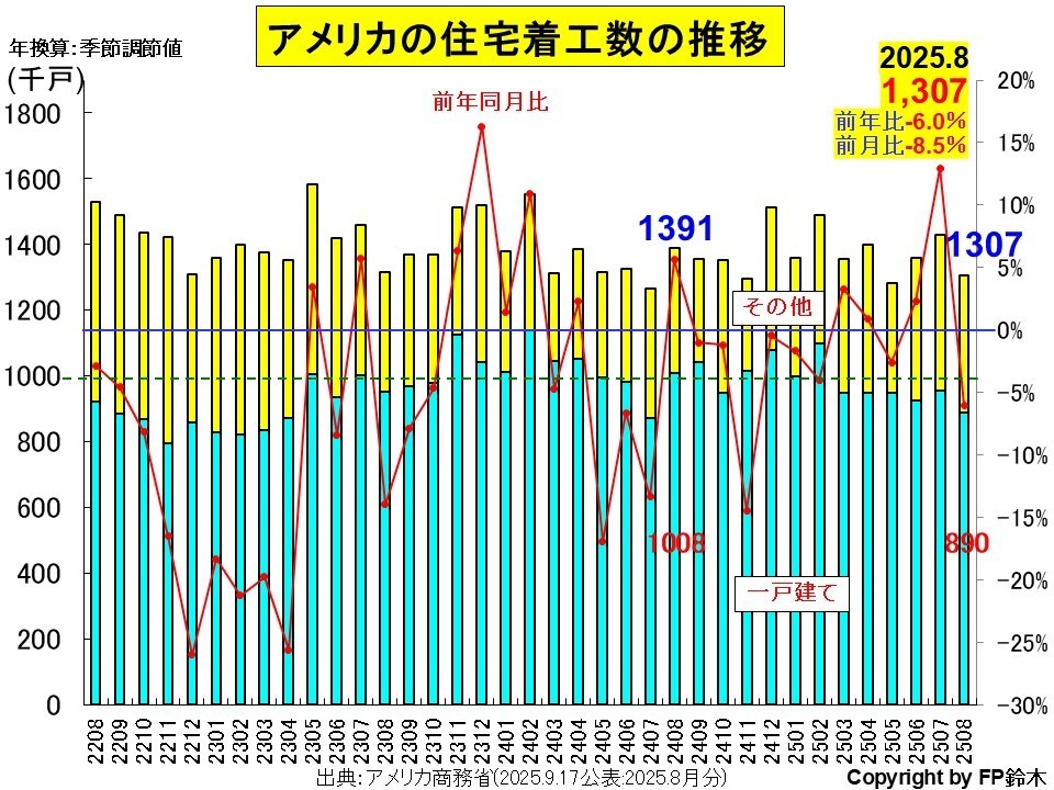 2025年9月17日にアメリカ商務省が発表した、2025年8月の「住宅着工数」は前年同月比で-6.0%、前月比では-8.5%。戸数は、年率換算で130.7万戸。