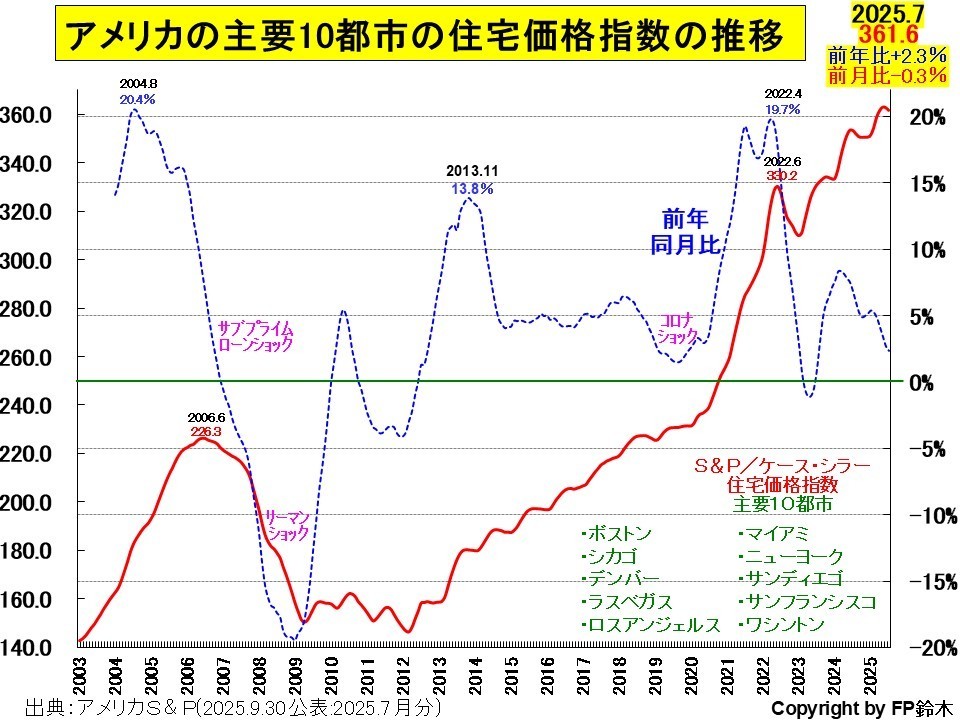 ◆2025年9月30日にアメリカS&Pが発表した、アメリカの主要な住宅価格指数「S&P/ケース・シラー住宅価格指数」によると、2025年7月の主要10都市平均の指数は、前年同月比+2.3%の上昇となりました。