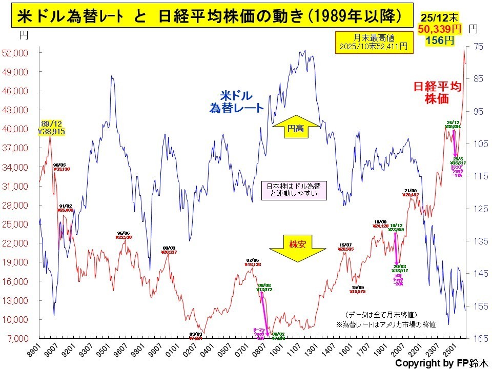 秋以降アメリカのFRBが利下げし、またAI半導体株の上昇や高市政権の誕生により、円安が進むと同時に積極財政への期待から株価はぐっと上昇し、10月末により史上最高値の52,411円を付けました。11月~12月は49,000円~50,000円を推移。