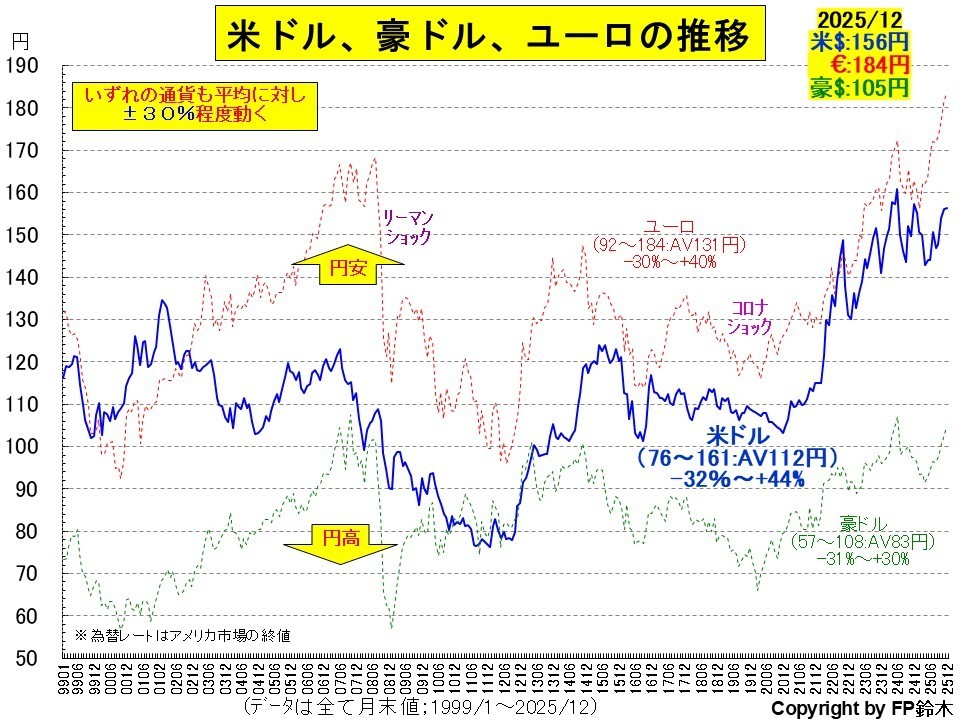 2025年は米ドルは2024年末比0.6%円高となったものの、ユーロは12.8%の円安、豪ドルは7.6%の円安となりました。