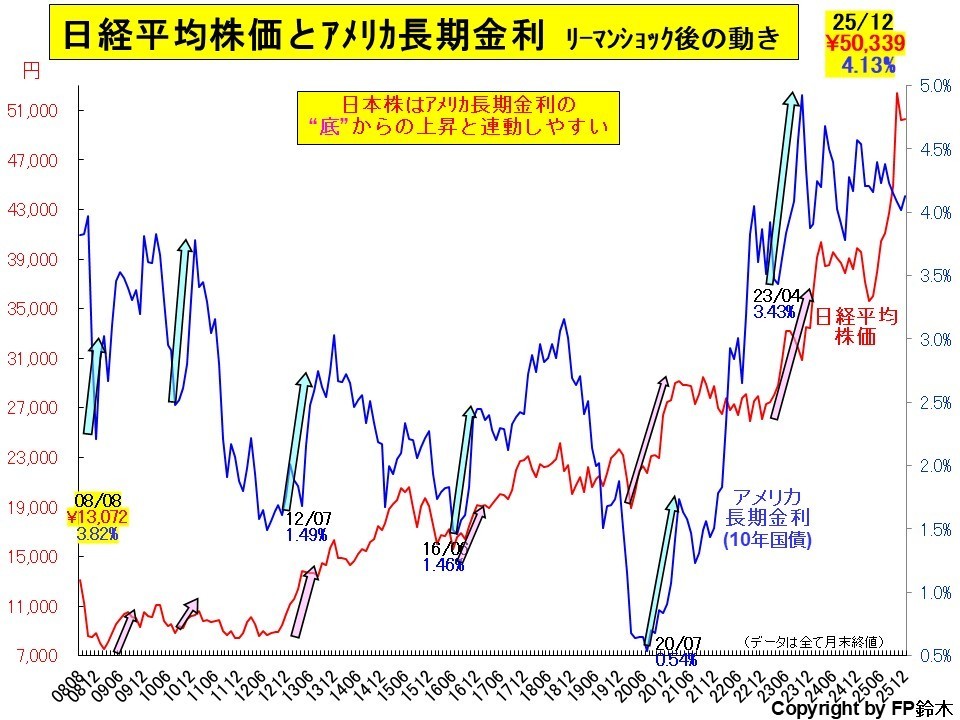 ◆日経平均株価は、アメリカの長期金利に影響を受けやすく、アメリカの長期金利が底を打って金利が上昇すると、株価も上昇する傾向があります。